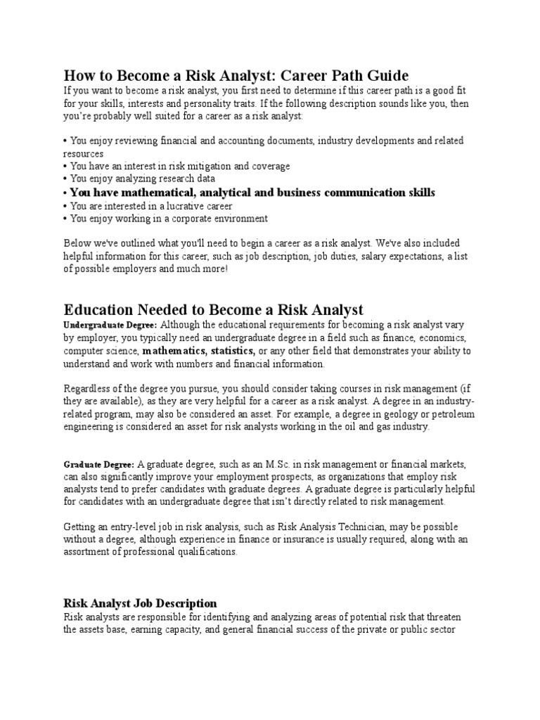 Financial risk analysts identify and analyse the areas of potential risk threatening the assets, earning capacity or success of organisations in the industrial, commercial or public sector. Risk management job description sample 8 examples in word pdf. As a financial risk analyst, you'll be responsible for predicting change and future trends, as well as forecasting cost to. Risk analysts are responsible for identifying and analyzing areas of potential risk that threaten the assets base, earning capacity, and general financial success of the private or public sector organizations that employ them or contract their services. Furthermore, politics, economic conditions and events in a particular region can. Financial risk analysts perform various functions, which covers providing management with evaluations of a bank's risk profile. Financial risk analysts generally specialise in one of four risk categories: Alluring financial risk analyst sample resume with additional risk. The ideal candidate is able to assist with investment decisions based on research performed by investing financial data from external sources. Designing and implementing an overall risk management process for the organisation, which includes an analysis of the financial impact on the company. Financial analysts help organisations to make informed financial decisions by analysing a company's financial performance, and making recommendations to management teams, based on their findings. The major tasks, duties, and responsibilities a financial risk analyst would normally perform are listed in the job description example below Risk management job description guide.
