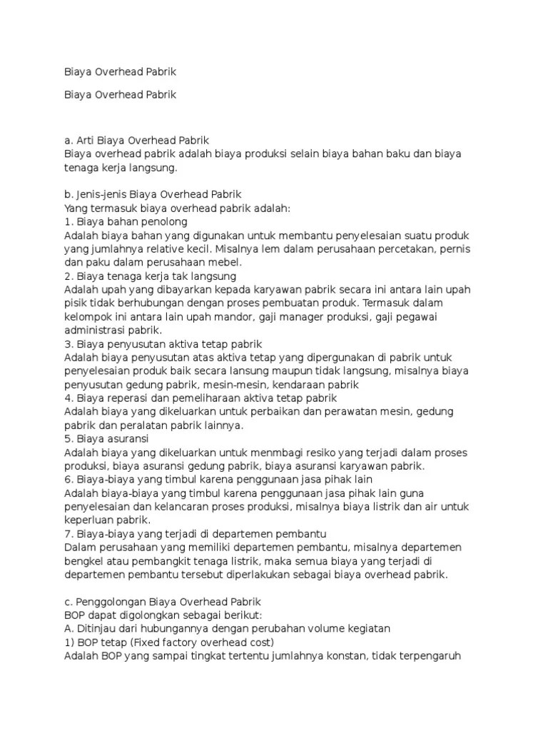 Umumnya, biaya seperti ini termasuk pada biaya tidak terduga dan tidak bisa diprediksi secara langsung dengan apa yang diproduksi pada suatu industri manufaktur. Pada basis pengukuran normal, seluruh kos produksi dicatat sebesar kos yang sesungguhnya terjadi, kecuali untuk overhead pabrik. Academia.edu is a platform for academics to share research papers. 2.000 = rp 5.000 per unit produk. Mengalokasikan biaya overhead pabrik dari departemen pembantu jawaban :